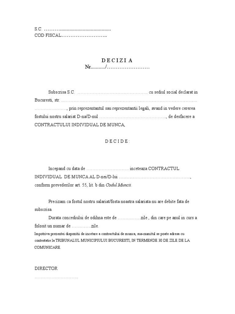 În termen de 5 zile de la încetarea raporturilor de muncă, prezenta decizie se va comunica la inspectoratul teritorial de muncă în raza căruia societatea comercială îşi are sediul social. La sfârșitul paginii sunt modele pentru descărcat ale deciziei de incetare contract conform art. 55contractul individual de muncă poate înceta astfel: Refuz acordare ajutor de somaj. Semnarea actului de incetare a contractului individual de munca in baza art.